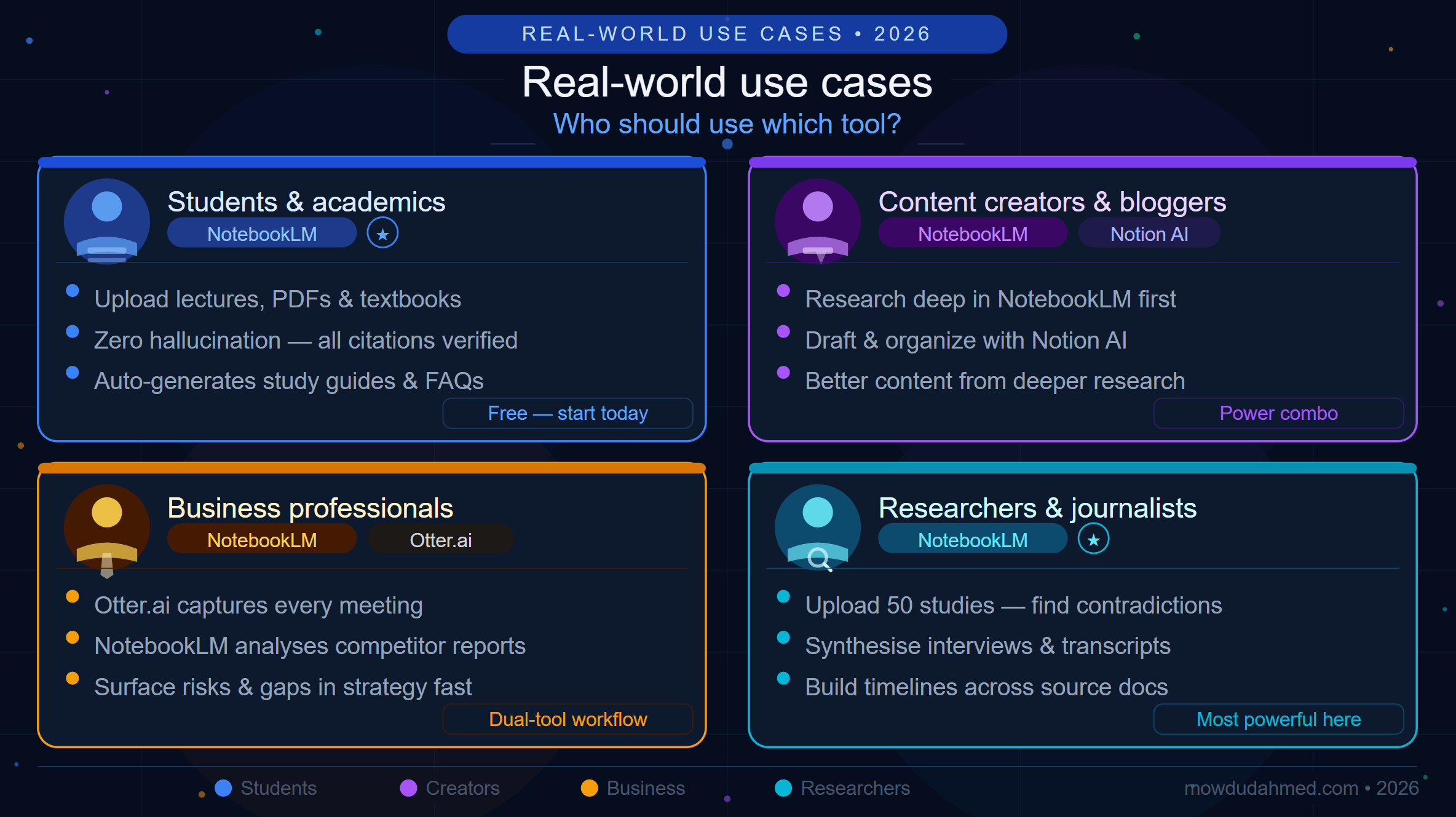 📌 Google NotebookLM — Best free research tool. Source-grounded AI that only answers from your documents.