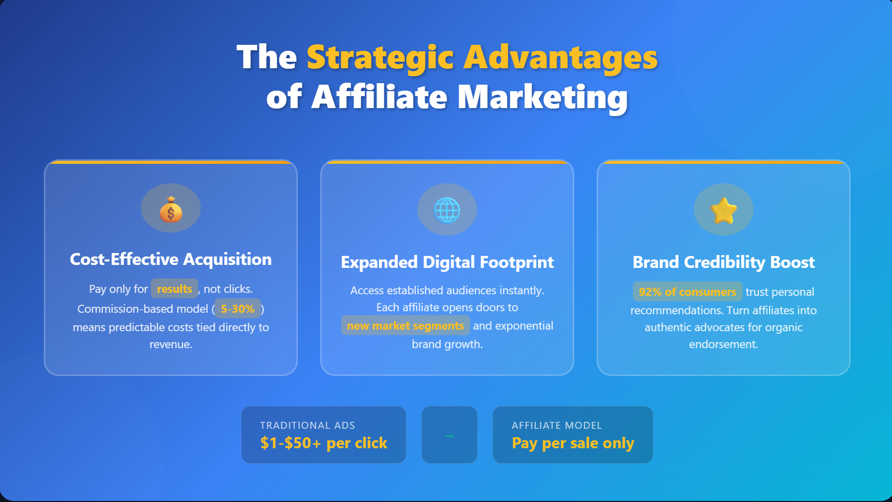 The financial efficiency of affiliate marketing cannot be overstated. Traditional advertising requires significant upfront investment with no guarantee of returns. Google Ads can cost anywhere from $1 to $50+ per click depending on your industry, and there’s no assurance those clicks will convert to sales. Television commercials, print ads, and sponsored content all demand payment regardless of performance.