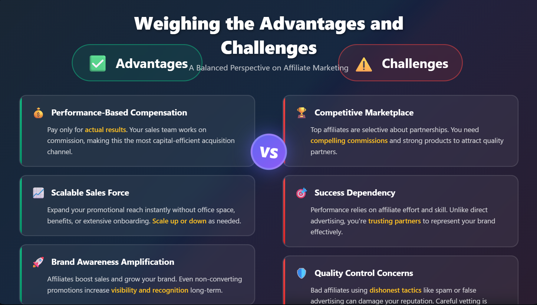 Competitive Marketplace: Affiliate marketing has become increasingly popular, meaning more businesses are competing for top affiliate talent. The best affiliates can be selective about partnerships, so you need compelling commission structures and strong products to attract them.