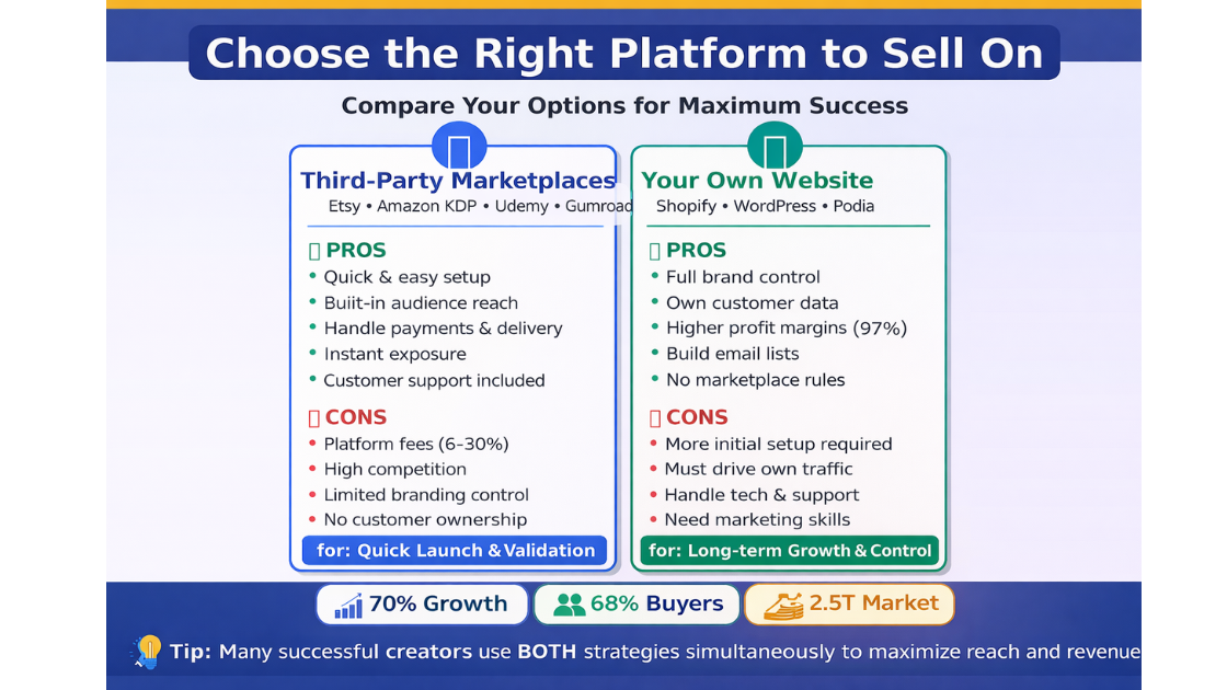 Many successful creators start on marketplaces to validate ideas and gather initial reviews, then expand to their own websites for greater control and profits. You can use both strategies simultaneously to maximize reach. Whichever you choose, ensure smooth checkout, automatic delivery, and clear customer support.