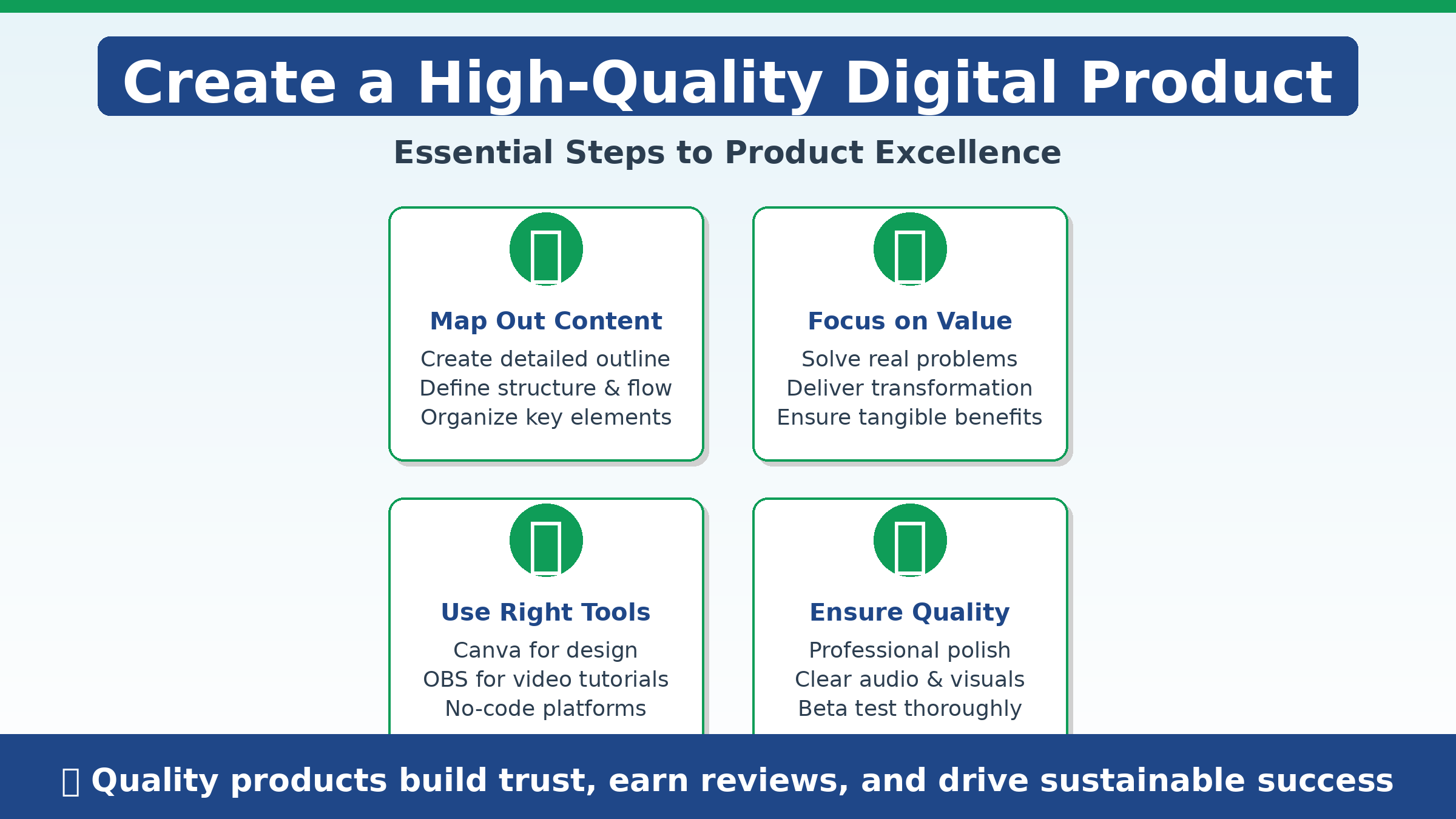 Ensure professionalism and polish: In competitive markets, presentation matters. For videos, prioritize clear audio—viewers forgive lower video quality but poor audio is a deal-breaker. For PDFs, maintain clean design with proper formatting and readable fonts. For software, ensure bug-free performance. Proofread thoroughly, test functionality, and verify everything works. If design or editing isn’t your strength, investing modestly in professional polish can elevate your product from okay to truly professional.