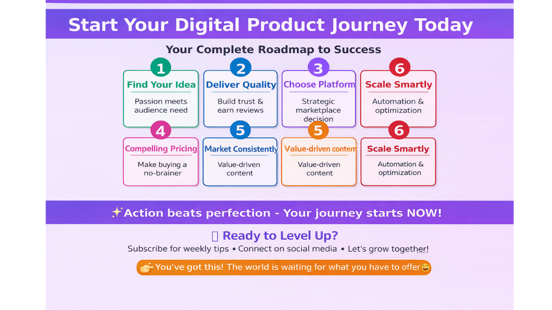 So what’s your first step? Maybe outline your product idea in detail, sign up for that marketplace account you’ve been considering, draft your first blog post announcing what’s coming, or simply commit to dedicating focused time each week to your digital product journey. Whatever it is, take action today. Action consistently beats perfection—your “good enough” product launched and improving is infinitely better than a perfect product that never sees the light of day.