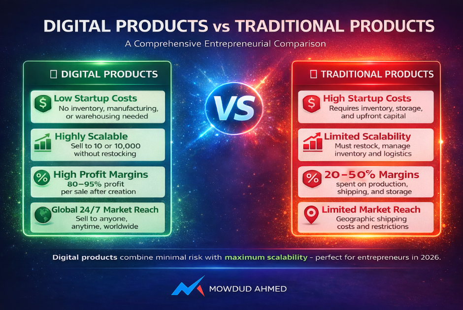 Why sell digital products? They offer unique advantages: low startup costs (no inventory needed), infinite scalability (sell to 10 or 10,000 people without restocking), global 24/7 reach, and high profit margins.