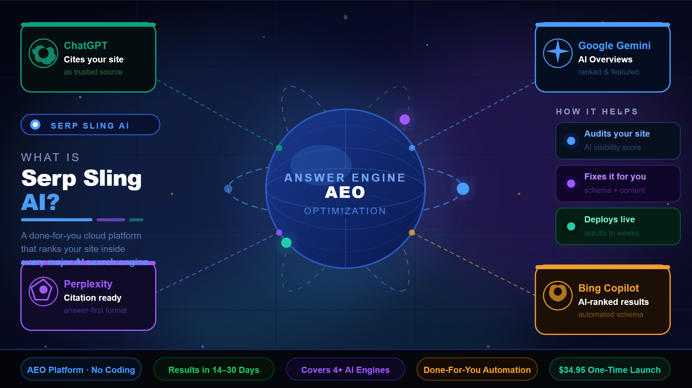 Serp Sling AI is a cloud-based platform designed specifically for Answer Engine Optimization (AEO) β the practice of getting your website cited and recommended by AI-powered search engines like ChatGPT, Claude, Google Gemini, and Bing Copilot.