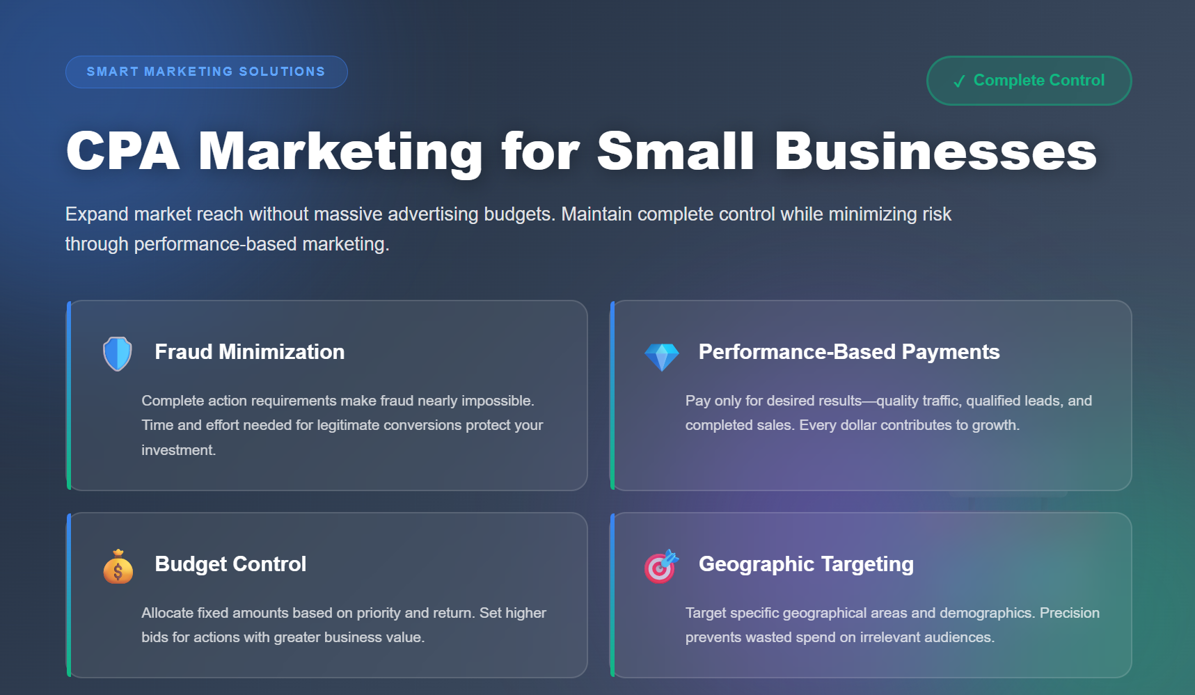 Small businesses can leverage CPA marketing to expand market reach without massive advertising budgets. As an advertiser, you maintain complete control while minimizing risk: