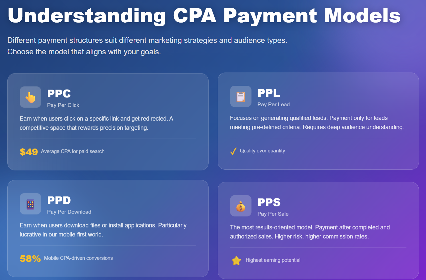 Not all CPA offers are created equal. Different payment structures suit different marketing strategies and audience types. Let me break down the main models you’ll encounter: